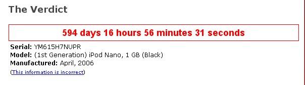 なんて記事を目にします。 かく言う私も iPod nano ユーザーなのですが 僕のもやはり突然寿命を迎えるのかと気にはなっていたのですが こんなサイトが紹介されていました。 「The iPod Deathclock」 お手持ちのiPodのシリアルNO.を入力 利用頻度なのどの質問数問に答えると 残りの日数を表示してくれます。 さて私のiPod nano ですが あの有名ブロガー 「群馬ではたらく社長のブログ(笑)」 の tomiya氏のプレゼント企画で 「新・堺ではたらく番頭!はんのブログ」の堺屋番頭!さまが抽選 番頭!さまのお嬢さんが私の名前を引当ててくださったお陰で tomiya氏からプレゼントしていただいたものです。 当時の記事はこちら<2006・8・16> <2006・9・15> もちろんまだまだ現役ですよ。 で早速シリアルNOを調べ(PCに繋いで iTunes で表示されます) サイトにアクセス 入力 簡単な設問にへんとうすると 594日16時間56分31秒後だそうです。 まだまだ1年以上大丈夫ですね(笑) もちろんコレは予測のみ 当たるも八卦 当たらぬも八卦 保証される数値ではありませんのであしからず。 PR |