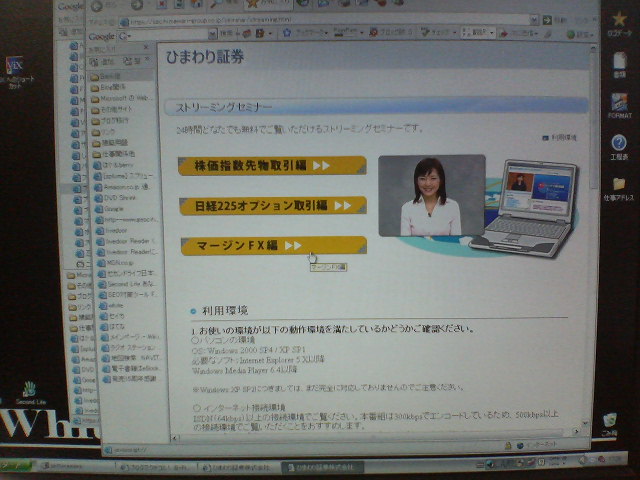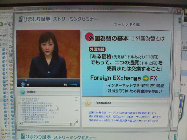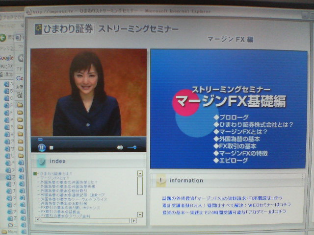 ※B-Promotionとは 各種製品やサービスを実際に体験してレビューアーが Blogにで感想を公表 新鮮な生の声を消費者や提供者へ発信するプロモーションサービス 他の宣伝サイトと違い ”必ず良い事だけを書く”宣伝だけではなく 悪いところも同時に公開することで 更に良い製品の開発にも役立てるプロモーションでもあります。 詳しくはHPへ https://b-promotion.jp/ 今回は 「ひまわり証券」のストリーミングセミナーです。 24時間誰でも無料で受講できるセミナーです。 講座の種類は 「株価指数先物取引編」 「日経225オプション取引編」 「マージンFX編」 以上の3種の講座が今回用意されています。 どの言葉も知らないっちゃあ知らないんですが・・・ 以前Blogにも書きましたが 株ブームがLivedoorショックで終息するまで ちょっとしたお小遣い程度株の売買をしていたのですが 結局今はまったくやっておりません。 しかし 最近巷では 「主婦の方がFXで大儲けした」なんてニュースが流れていたような。。。。 ってことで 「マージンFX編」を受講してみました。 まずは セミナーのページ https://sec.himawari-group.co.jp/seminar/streaming.html でもって 「マージンFX編」をクリック アクセス後 すぐにセミナースタートです。 女性の解説に沿って 右の画面に資料を表示 とっても見やすいですね。 解説もゆっくり丁寧に ”素人”にわかり易いような口調での説明となってます。 しかも センテンス毎に項目分けがシッカリされているので 理解できなかったポイントなんかは再度聞くことが簡単にできます。 しかし 説明はすすむにつれ ”素人”では理解できない言葉 翌日にポジションをとる??とかなんとか ポジションってなんじゃ? となりそう。 当然為替や株を扱おうなんて人なら ”知ってなきゃいけない言葉”でしょうからいいのですが 利用者の裾野を広げる ってことになると別で さらにもっと初歩の初歩からの講座もあったらいいのではなでしょうか? 僕のレベルが低すぎるのがそもそも問題なのですが おおよその事柄については把握できたものの 理解できたか?と言われると どうでしょ?となりそうです。 用語集やテキスト持参でないと理解までは難しいのではないでしょうか? ステップ分けなんかをしてみるといのかもしれないとおもいました。 しかし 基礎知識がちゃんと入ってる人であれば わかり易い講座であり 24時間いつでも受講できるってことは 忙しいビジネスマンの方も 昼間に時間がある主婦の方にもとっても便利な講座だと思います。 ただいまひまわり証券では 各種口座開設キャンペーンを行っているようです。 http://fx.himawari-group.co.jp/campaign/ 興味ある方は是非この機会にチャレンジしてみてはいかがでしょう |