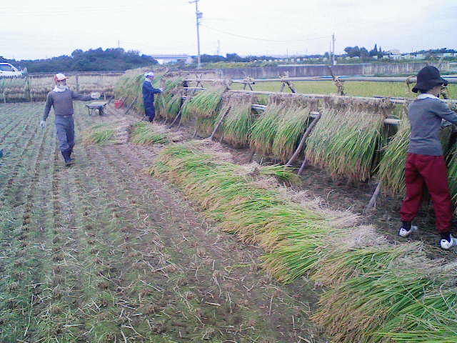× [PR]上記の広告は3ヶ月以上新規記事投稿のないブログに表示されています。新しい記事を書く事で広告が消えます。 今日は一日農家体験をしてきました。 この稲刈り機 刈った稲を紐で結束してポイッっとやってます。 かなり昔からある機械らしいのですが コンバインで稲刈りから籾の袋詰めまで一気にやっちゃうのは見たことありますが こんなに小さい機械でソコまで出来る事にオドロキ~ でした。 その後は義父の組んだ竿に稲を干します。 コレも鉄パイプだとうまく干せないようで こだわりの作業 途中 藁を買いたいといったお客さんが来て 竹で干したもののほうがいい感じに乾燥している と言ってました。 この状態で乾燥させて脱穀 精米 したあと美味しい御餅になるんですね~ もちろん この作業中 カエルやバッタがピョンピョンしまくり イナゴにとっては春のようですね。 ごちそうさまでした。