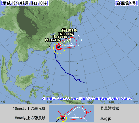 いたって・・・・・ 不調でございます。 正直 鞭打ちを舐めてました・・・・ 事故後一週間経過しますが 事故直後はピンピンしておりましたが 現在痛くて会社休もうかって思うほど・・・ しかし これって事故が酷かったわけではなく 台風の影響なんだそうですね <画像は気象庁HPより> 現在話題になってます 台風第4号(マンニィ) そういえば台風の名前定着しませんね このマンニィはじめ 台風=超低気圧 この低気圧の影響で痛みが出る事も多いそうです (整形外科の先生:談) ですので タイミング的には最悪な事態です。 結局事故のほうは人身扱いに切り替えるそうです。 人身事故といっても医師の診断書が全治1週間だと ”免停とかにはならない” そうですね。今回はじめて知りました。 まぁこれで安心して治療を受けられます。 これで台風が無事に通過してほしいですが 各地で被災された方も多いですよね これ以上大きな災害にならなければいいのですが・・・・ 被災者の方 救済に向かう自衛隊の皆さん 頑張ってください 。事故のせいか? |